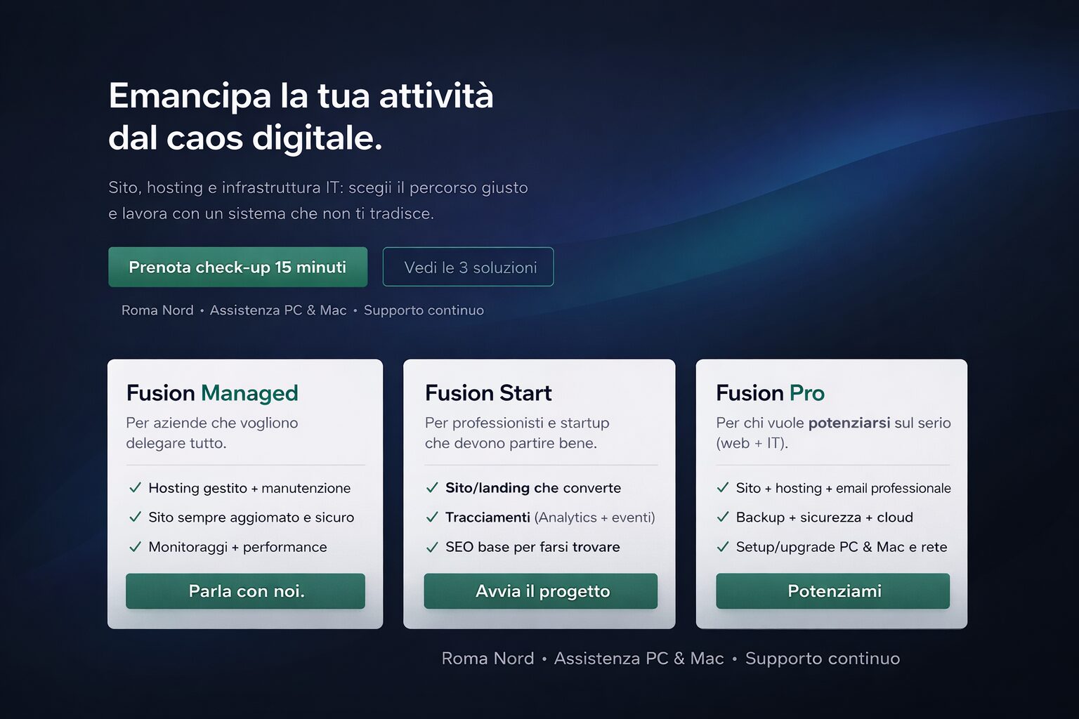 Da oltre 15 anni progettiamo siti funzionali con AI integrata. Offriamo hosting sicuro e ottimizziamo la SEO per massimizzare visibilità e clienti. Siamo AI-friendly e integriamo soluzioni intelligenti per migliorare l’esperienza utente. Configuriamo Google Analytics e tracciamenti avanzati per monitorare ogni risultato. Ti accompagniamo in ogni fase, dal concept al lancio, per potenziare davvero la tua presenza online.